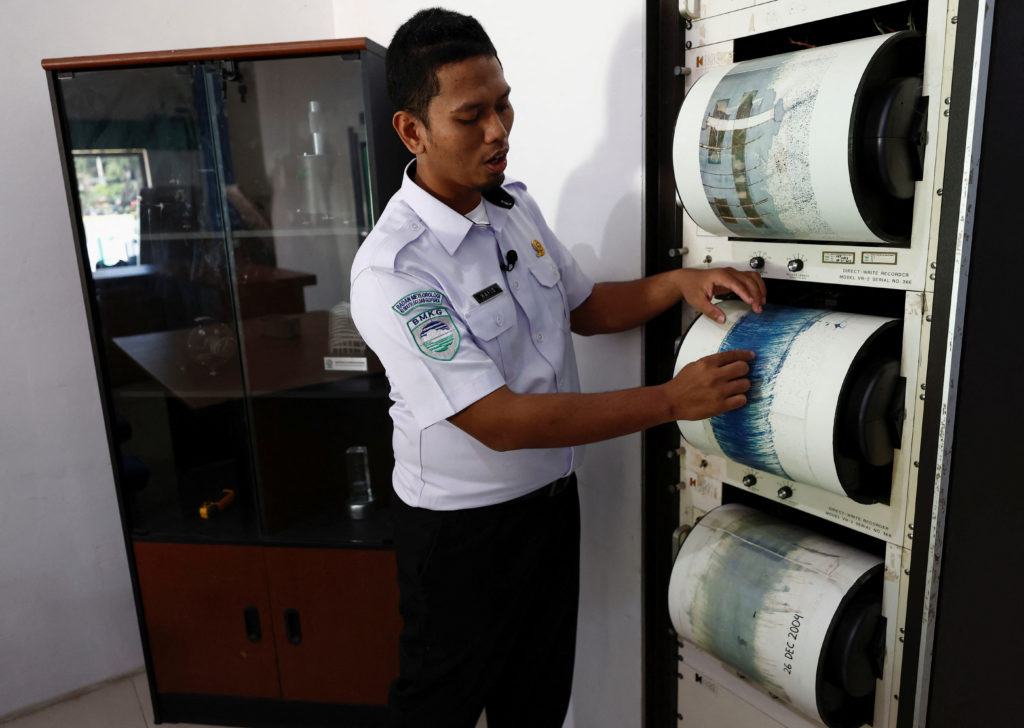 Teuku Hafid Hududillah, 28, an Indonesia’s Meteorology, Climatology and Geophysics Agency (BMKG) officer, shows the seismograph system that recorded the 9.1 magnitude quake on the 2004 Indian Ocean earthquake and tsunami, at the monitoring station in Aceh Besar, Aceh, Indonesia, Dec. 23, 2024. Photo by Willy Kurniawan/ Reuters