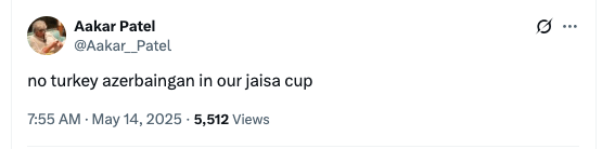 Patel dropped another post mocking the boycott calls against Turkey and Azerbaijan and wrote, “no turkey azerbaingan in our jaisa cup.”
