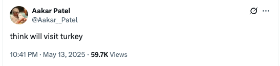 In this vein, Aakar Ahmed Patel, the former head of Amnesty India, took to X to support Turkey and wrote: “think will visit Turkey”.