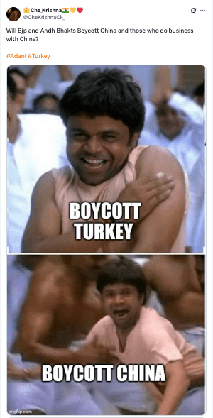 One pro-Congress troll, seemingly triggered with boycott calls against Turkey, asked ‘Bhakts’ if they would “boycott China and those who do business with China?”