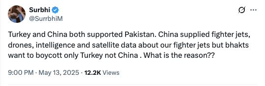 Another X user asked why ‘Bhakts’ are not boycotting China even though it has supplied fighter jets, drones, intelligence and satellite data about Indian fighter jets to Pakistan.