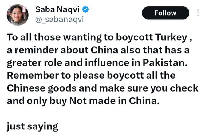 Meanwhile, Saba Naqvi expressed her anguish over the “Boycott Turkey” by bringing up China, which has been an all-weather ally of Pakistan. “To all those wanting to boycott Turkey, a reminder about China also that has a greater role and influence in Pakistan. Remember to please boycott all the Chinese goods and make sure you check and only buy Not made in China. just saying,” Naqvi posted.
