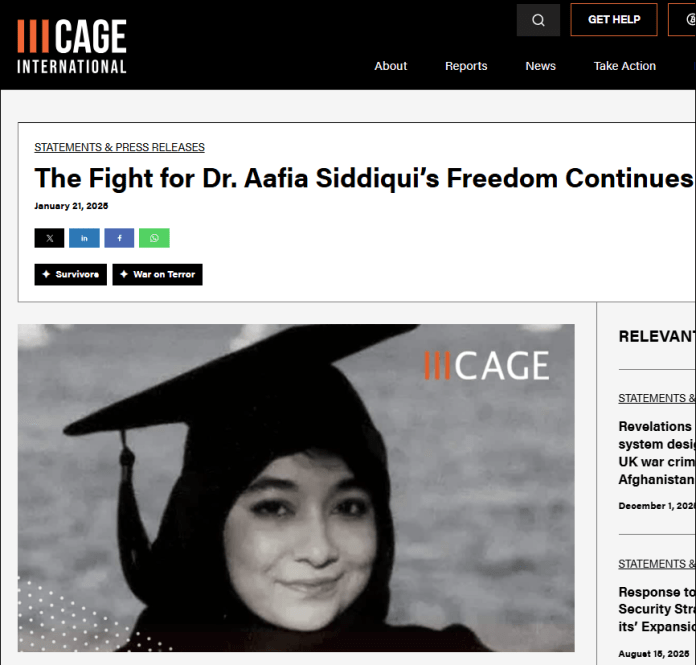 In addition, CAGE International has also advocated for the release of ‘Lady Al-Qaeda’ Aafia Siddiqui, who is serving an 86-year jail sentence after conviction in the case involving an attack on US officials in Afghanistan. Gplus reported earlier that in 2008, the US Department of Justice had found a number of items in her possession, including handwritten notes that mentioned a mass-casualty attack.