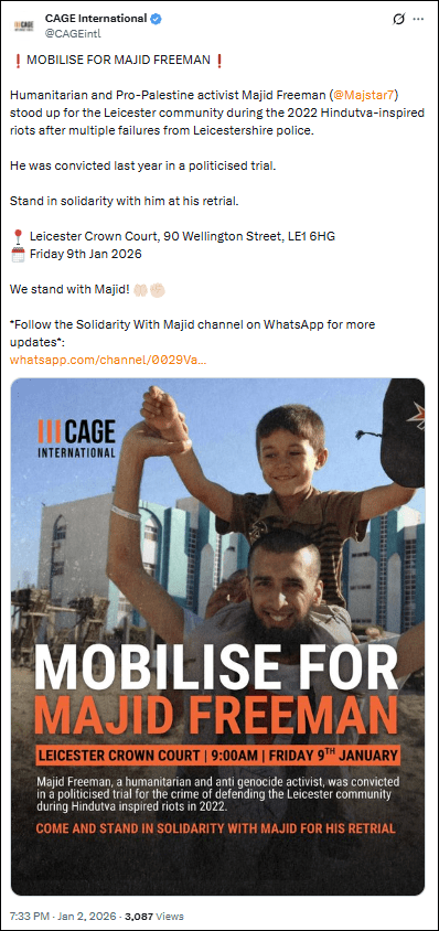 “MOBILISE FOR MAJID FREEMAN. Humanitarian and Pro-Palestine activist Majid Freeman stood up for the Leicester community during the 2022 Hindutva-inspired riots after multiple failures from Leicestershire police. He was convicted last year in a politicised trial. Stand in solidarity with him at his retrial. Leicester Crown Court, 90 Wellington Street, LE1 6HG. Friday 9th Jan 2026. We stand with Majid!” CAGE International wrote on X.