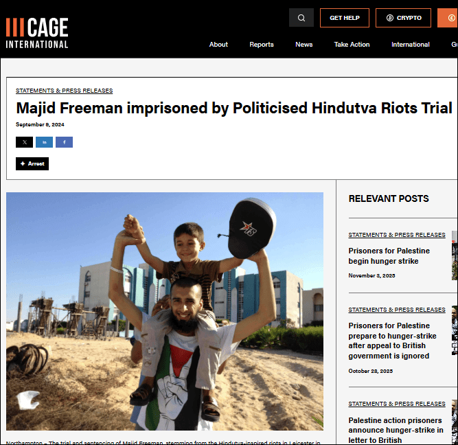 CAGE International, previously known as CagePrisoners Project, is mobilising support for Majid Freeman ahead of his retrial in the Leicester case on 9th January. In a flyer, CAGE International described Freeman as a ‘humanitarian’ and ‘anti-genocide activist’. It claimed that he was “convicted in a politicised trial for the crime of defending the Leicester community during Hindutva-inspired riots in 2022.”