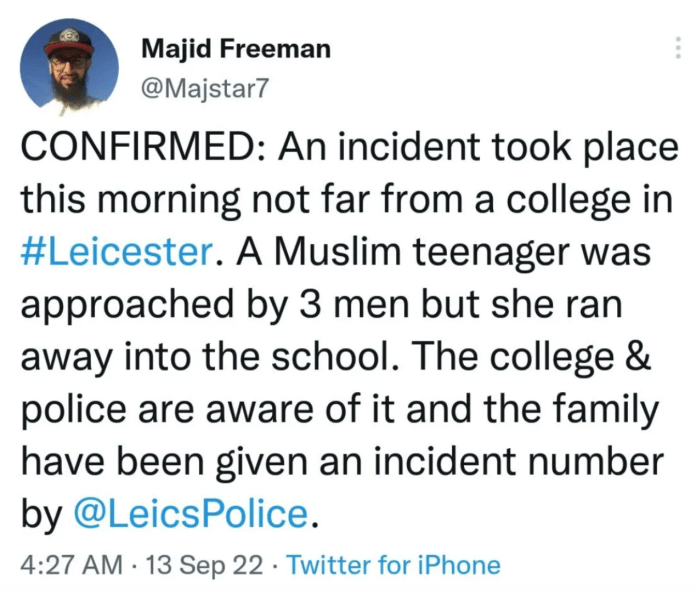 Furthermore, Freeman had sparked tensions by falsely accusing a group of Hindu men of chasing and assaulting a Muslim teenager. On 4th September 2022, while Muslim mobs were attacking Hindus in Leicester, Freeman further incited his local coreligionists against Hindus through social media.
