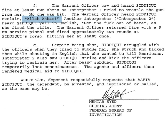 Siddiqui was shot at least once; however, she continued to kick and assault the officials while shouting “Allahu Akbar”. Aafia Siddiqui was also yelling in English that she wanted to kill Americans. “May the blood of [unintelligible] be directly on your [head/hands]” and “I am going to kill all you Americans,” she allegedly said.