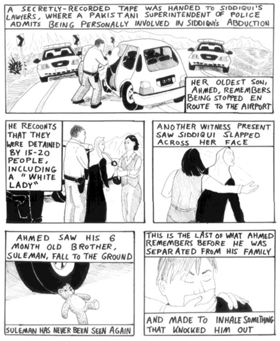 The FBI questioned Siddiqui and her then-husband, Amjad Khan, about their suspicious purchases like night-vision goggles, and manuals on explosives, body armour and 45-military-style books including The Anarchist’s Arsenal. During his FBI interview, Amjad Khan claimed that he brought these materials for camping and hunting. Amidst the FBI investigation, Aafia and her husband divorced and she returned to Pakistan with her three children.