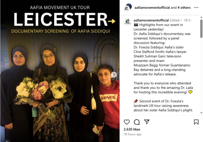 Dr Fowzia Siddiqui, the sister of convicted al-Qaeda terrorist Aafia Siddiqui, has been running the “Aafia Movement” to secure her release. As their website, “The Aafia Movement is an international initiative dedicated to securing justice and freedom for Dr. Aafia Siddiqui, a Pakistani-Muslim woman currently serving an unjust 86-year sentence in U.S. federal prison.”
