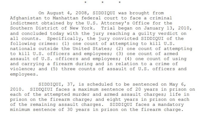 On 23rd September 2010, the United States Attorney for the Southern District of New York, Preet Bharara, announced that Aafia Siddiqui has been sentenced in Manhattan federal court to 86 years in prison for the attempted murder and assault of U.S. nationals and U.S. officers and employees in Afghanistan. Judge Richard Berman found guilty Aafia Siddiqui guilty of all charges brought up against her. Judge Berman cited Siddiqui’s ‘high intelligence’ and al-Qaeda links as aggravating factors.