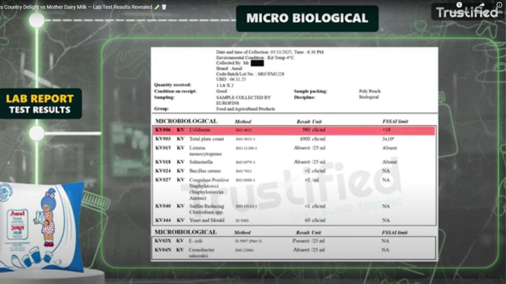 A large count of coliforms was detected in Amul Taaza
