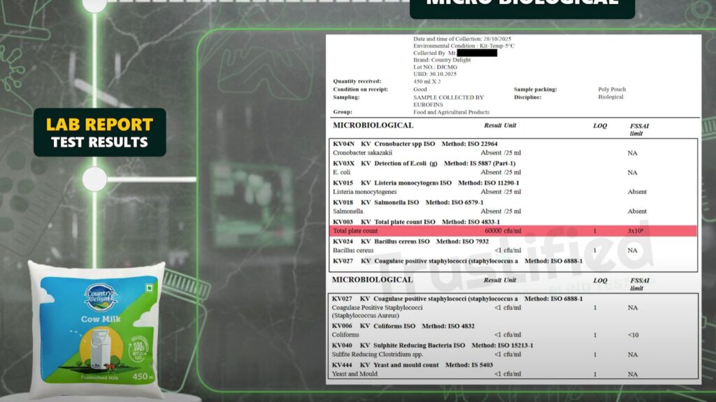 Country Delight cow milk, which has an aggressive marketing campaign promoting “fresh milk straight from the farmlands to your homes,” the TPC levels were found to be twice as much, 60,000 CFU/ml, compared to the safety limit, which is 30,000 CFU/ml.