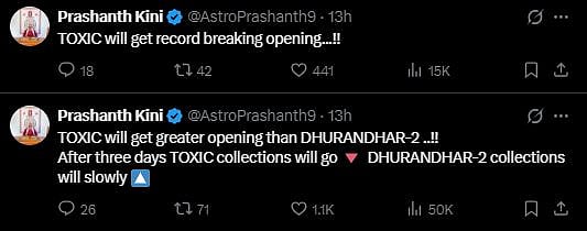 Kini tweeted, “TOXIC will get greater opening than DHURANDHAR-2 ..!! After three days TOXIC collections will go 🔻 DHURANDHAR-2 collections will slowly (sic).” Check out the tweets below…