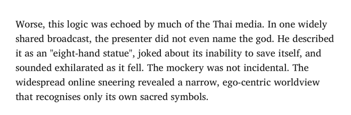 The editorial mentioned that one anchor in Thai TV called the Lord Vishnu statue an ‘eight-hand statue’, did not even bother to name it, and mocked how, despite having 8 hands, “it could not save itself.” The editorial called the readers to note the point mentioned by Indian government in their response, that, Hindu and Buddhist traditions share the same civilisational heritage, and reminded the military and media that the blatant display of insensitivity and mockery will give Thailand a bad image internationally, because Hindu cosmology has deeply inspired Thailand’s own culture and mocking the Hindu faith while being reverent of only Buddhist symbols displays the people’s own ignorance about their cultural roots and shared history.