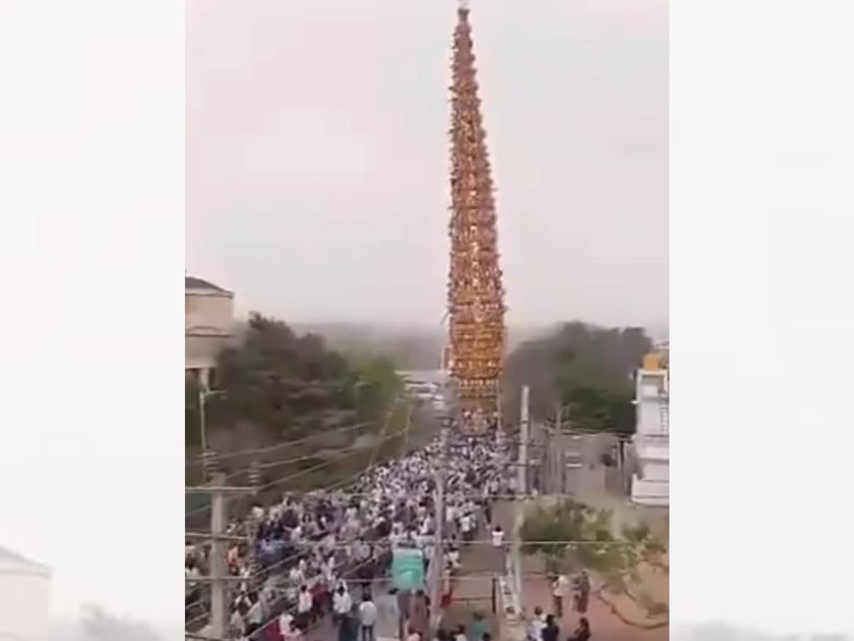 The incident occurred on Saturday, March 23 as devotees pulled the chariot toward the temple when strong winds and heavy rain reportedly caused it to lose balance and crash.