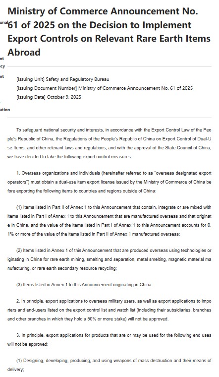 The Chinese MOFCOM’s announcement number 61 goes beyond REE export restrictions and says, “Overseas organizations and individuals (hereinafter referred to as “overseas designated export operators”) must obtain a dual-use item export license issued by the Ministry of Commerce of China before exporting the following (listed) items to countries and regions outside of China.”