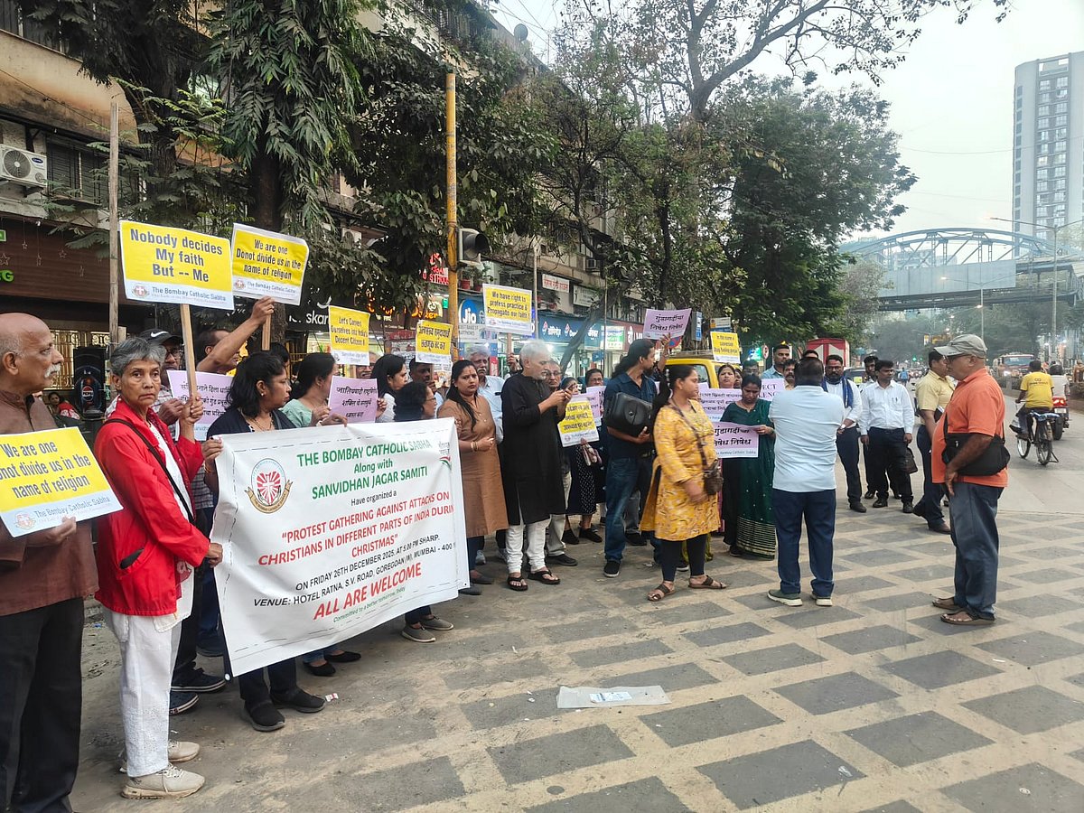Citizens gathered at Goregaon on Friday evening to condemn incidents of hate and intimidation targetting Christian communities during the Christmas season. |