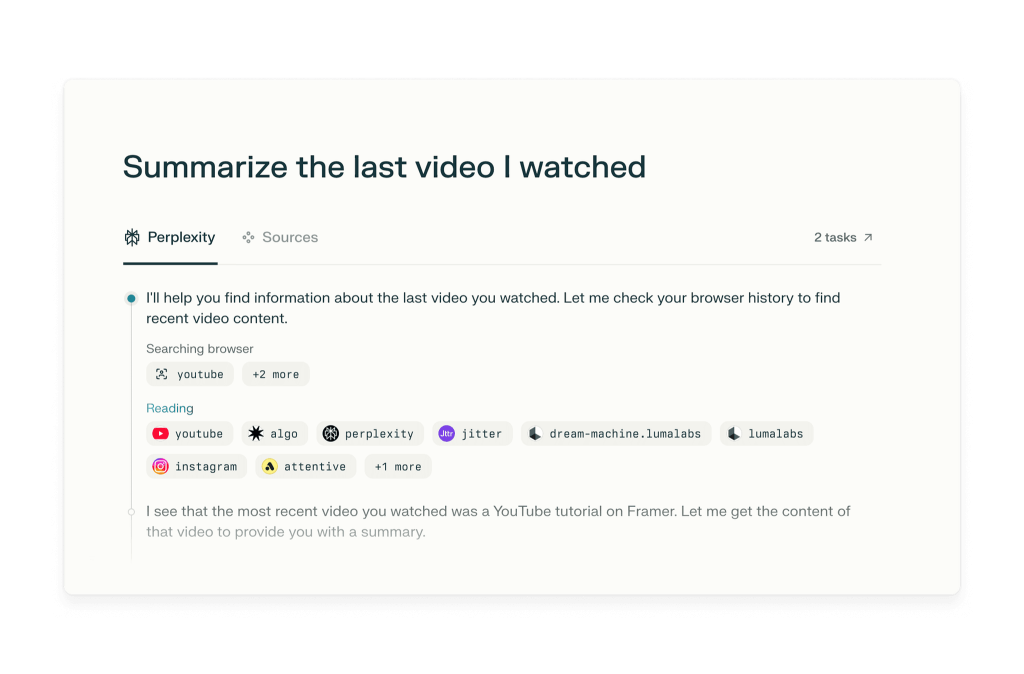 It comes integrated with Perplexity search. Instead of showing 10 blue links like Google, Comet gives you direct results, summaries, and suggestions. The browser remembers your research history and gives better answers over time.