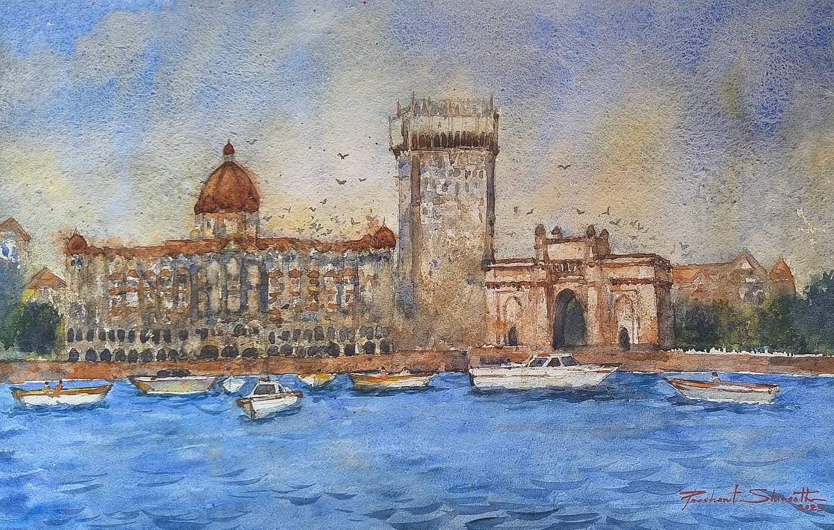 Among the many pieces on display, one holds a particularly special place in Shirsath’s heart, his painting of the Taj Mahal Palace Hotel. “When you look at the Taj from a boat out in the sea, it looks magical. It’s almost unreal,” he says. That exact feeling awe, admiration, and peace, is what the painting captures. “It’s my favourite work. I feel like I fall in love with the city all over again every time I look at it.”