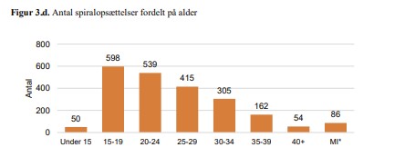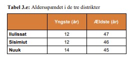 The data indicates that the age distribution for IUD placements across the three districts— Ilulissat, Sisimiut, Nuuk, was highest in the 15 to 19 age group, followed by 20-24, 25-29. With youngest age being 12 and eldest being 47 in Ilulissat, 12 (youngest) and 46 (eldest) in Sisimiut, and 14 (youngest) and 45 (eldest) in Nuuk district.