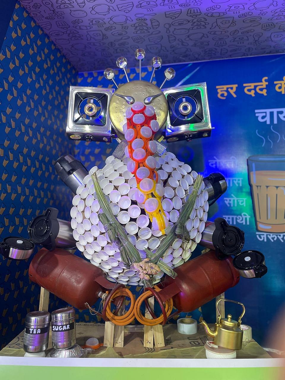 Residents of the Shrinivas building have been creating eco-friendly Ganesh installations for over 15 years. In 2024, they designed an idol from kitchen utensils, which were later distributed to the public. This year, they continue the tradition with a clay idol purchased from the market.