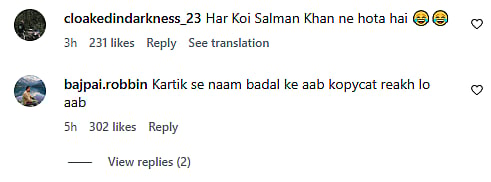 Another Instagram user wrote, “Kartik se naam badal ke aab kopycat reakh lo (sic).” One more netizen commented, “Oooo bhai khuda k waastay tu kisi ko bhi copy ker mager salman bhai ko chor dey… (sic).” Check out the comments below…
