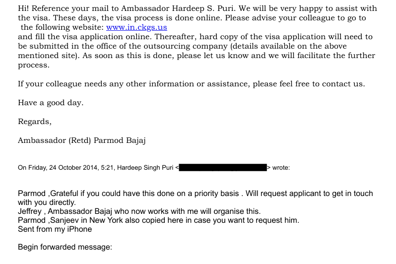 Puri connected him to Pramod Bajaj, then a former Indian consul in New York and later ambassador to South Sudan. “Bajaj now works with me, would organise this,” stated his email.