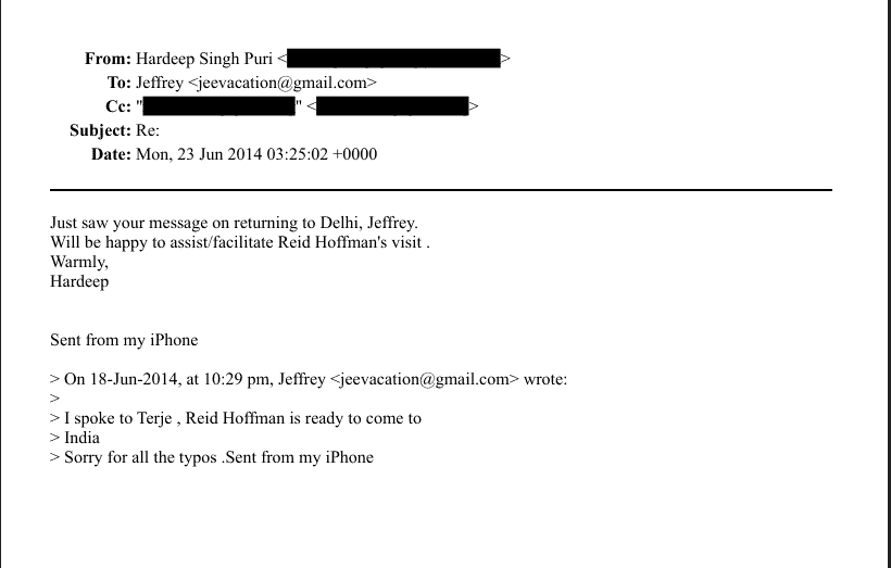 On June 23, 2014, Epstein introduced Puri to Reid Hoffman, co-founder of LinkedIn, who was scheduled to visit India. Puri replied in the affirmative, “happy to assist/facilitate Reid Hoffman’s visit.”