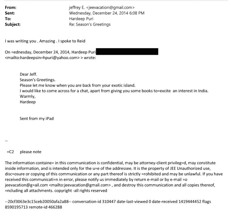 The following day, on September 25, Reid replied to Puri and Epstein, “Hardeep: very nice to meet you. Jeffrey has exquisite taste in people” and asked the minister if they could meet in Silicon Valley or New York in 2015.