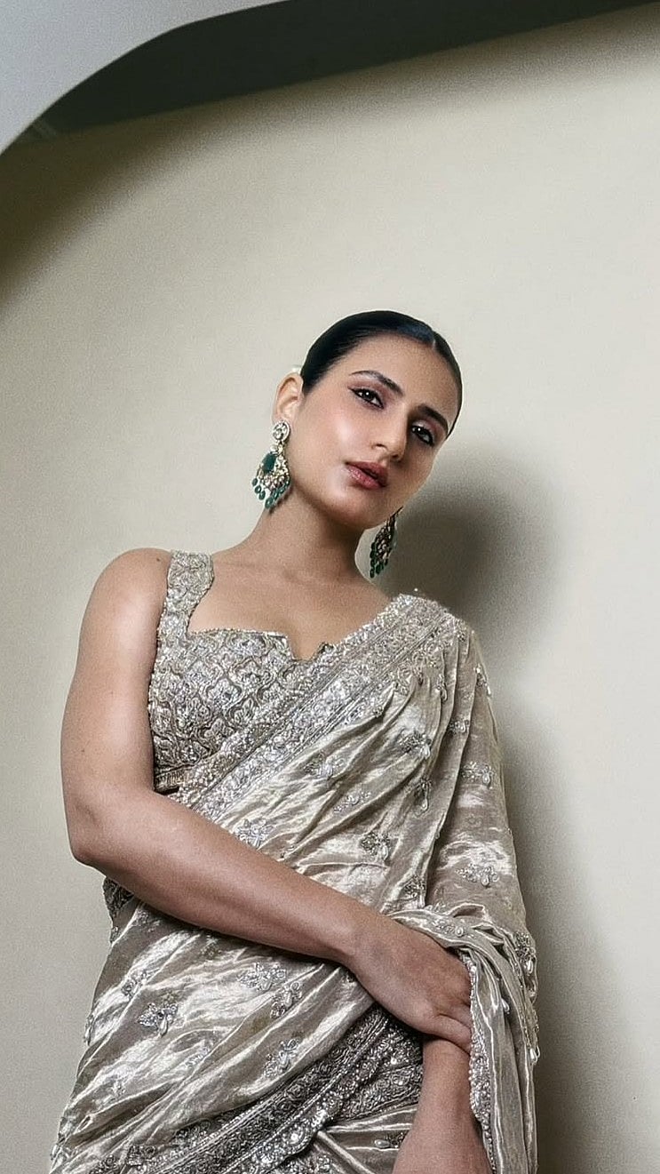Rounding off her saree edit, she was seen in a metallic grey tissue saree crafted with crushed textures, teamed with a delicately embroidered silver blouse—a moderm option for cocktail wedding nights