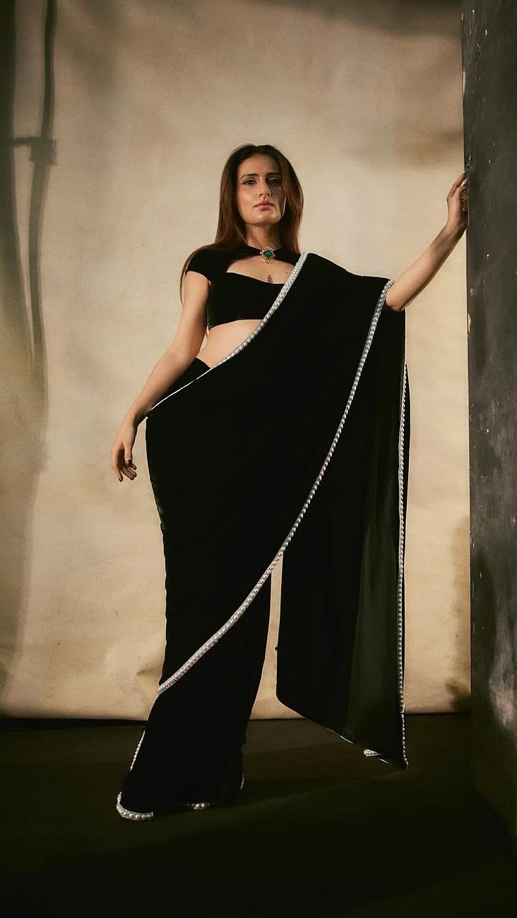 Turning up the drama, Fatima draped a pearl-adorned black velvet saree with a bold cut-out blouse accented by an emerald brooch—a striking choice for evening wedding functions