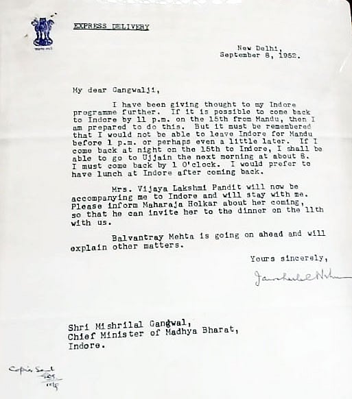 In a letter dated September 8, 1952 to “Shri Mishrilal Gangwal, Chief Minister of Madhya Bharat, Indore” Prime Minister Jawaharlal Nehru has said that his Indore, Ujjain and Mandu visit be arranged in such a manner that he can have lunch at Indore. He also informed the chief minister that “Mrs. Vijaya Lakshmi Pandit will now be accompanying me to Indore … .Please inform Maharaja Holkar about her coming, so that he can invite her to the dinner on the 11th with us.”