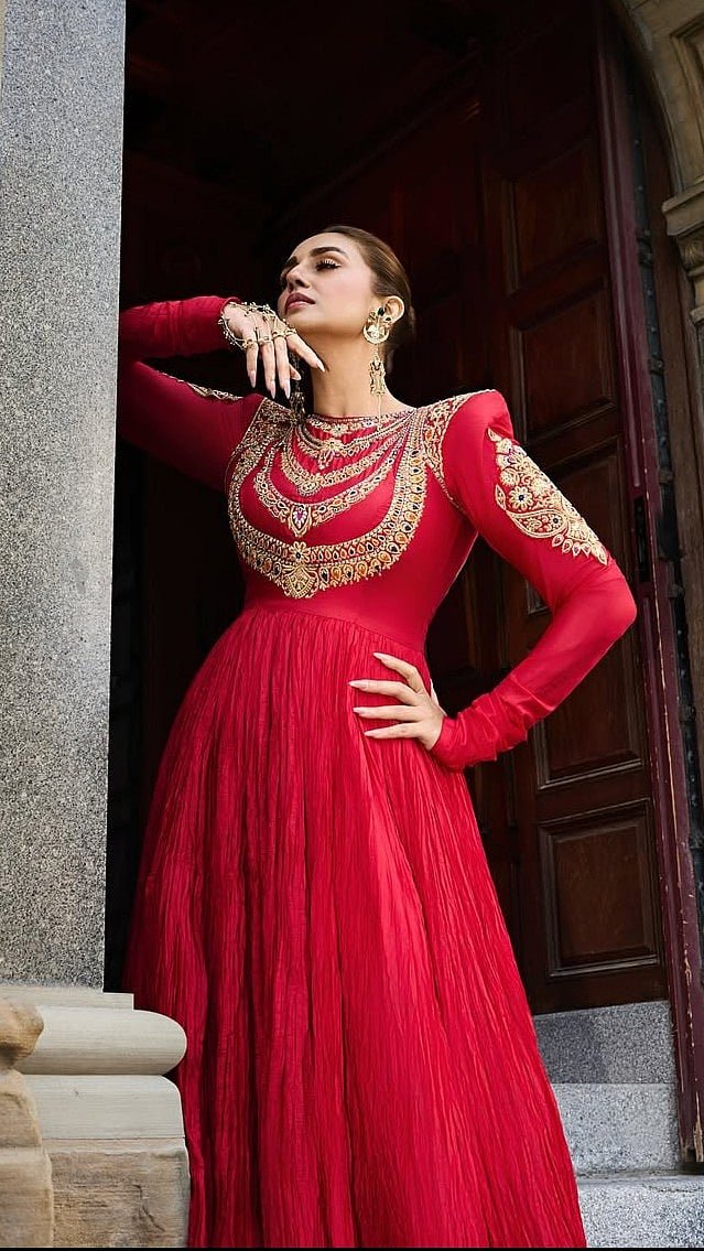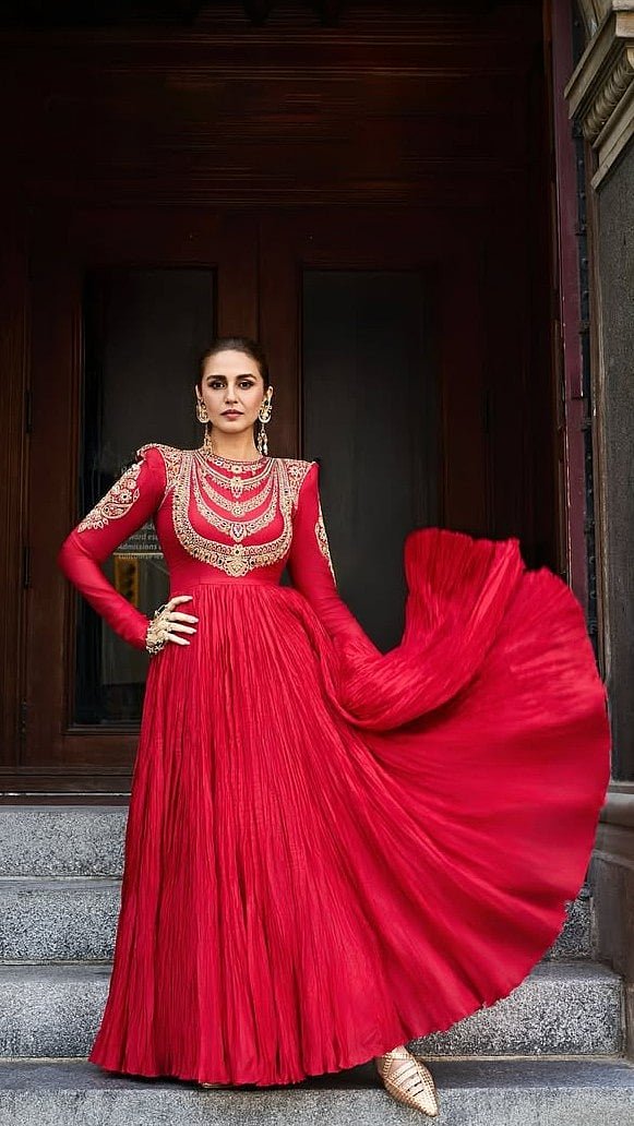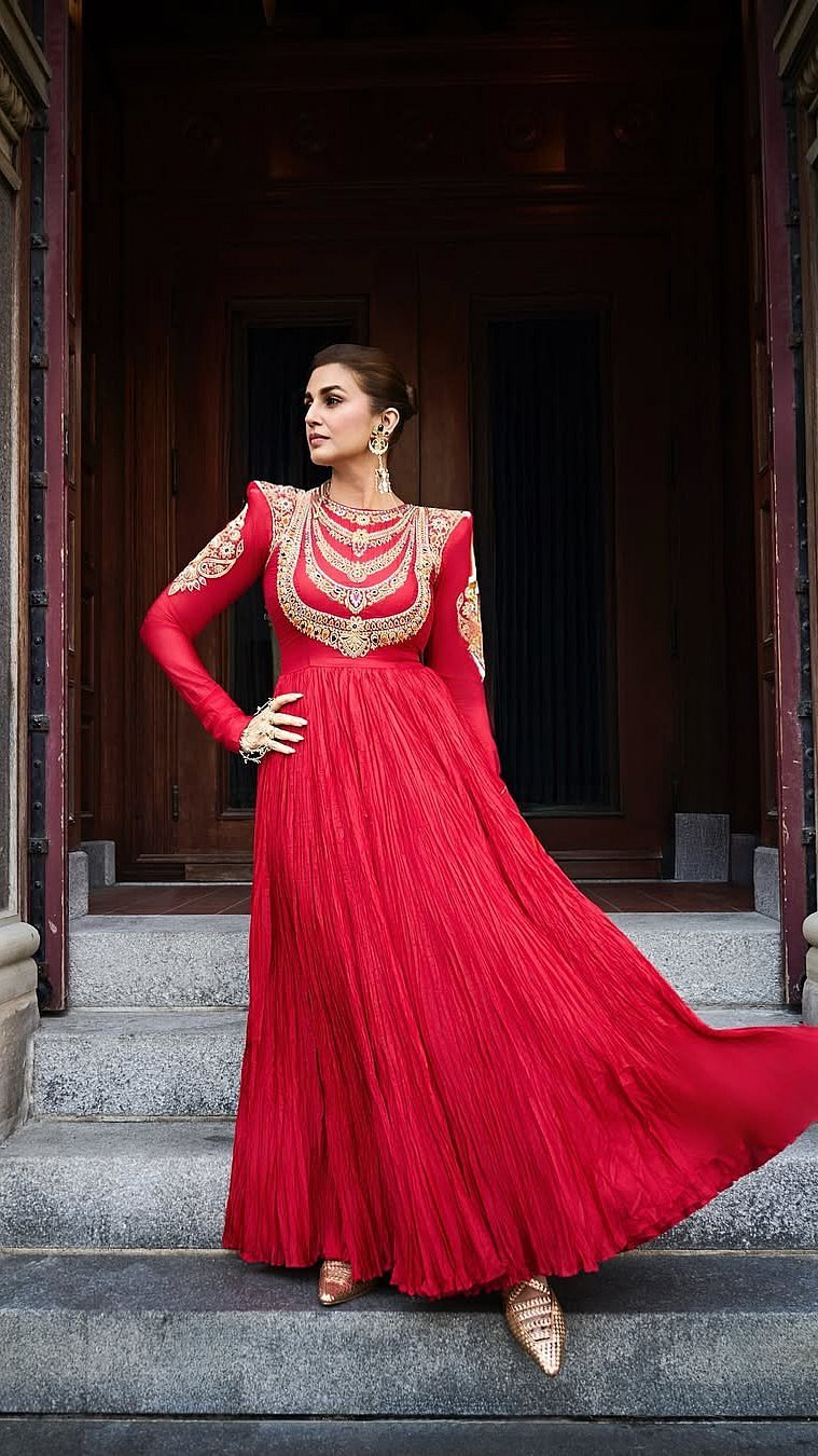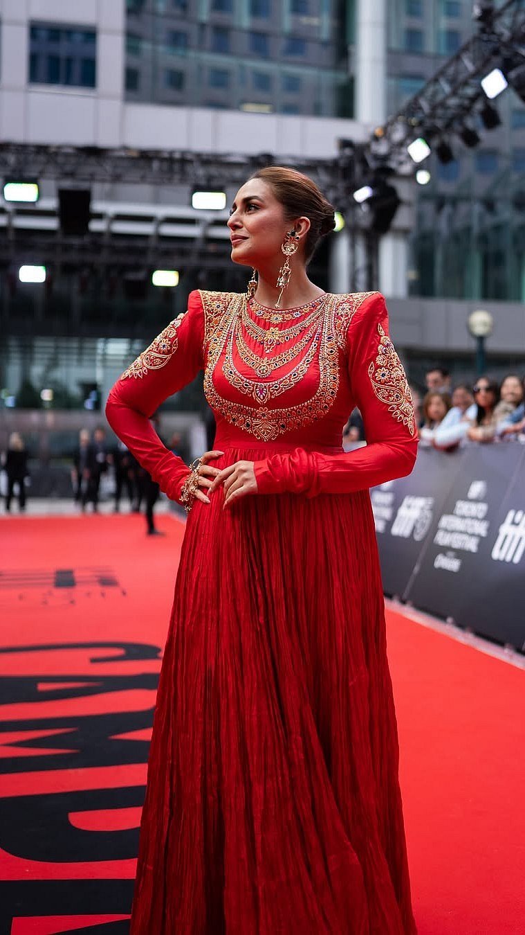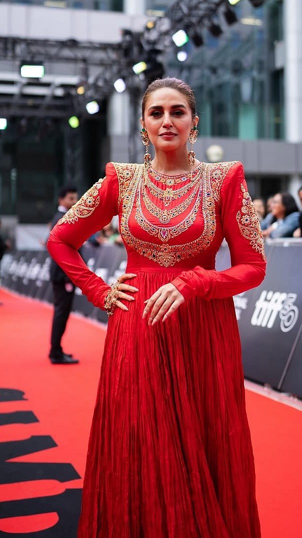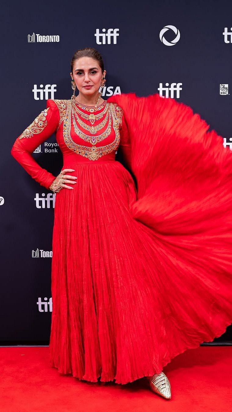 When it comes to blending drama with grace, Indin actress Huma Qureshi never misses the markAt the Toronto International Film Festival (TIFF), the actress turned heads in a striking red Anarkali by ace Indian designer duo Abu Jani Sandeep KhoslaThe silk crushed ensemble featured a floor-sweeping silhouette with intricate gold embroidery complementing the red hueHer statement gold accessories were equally breathtaking, coordinating with the delicate pattern of the Anarkali Huma donned a pair of dangling gold earrings and hand ornaments, for elegant yet elevated touchThe actress opted for a subtle yet glowing makeup with a dewy base, blushed cheeks, mascara-coated lashes and nude lips Her hair was styled in a sleek, pushed-back bun, letting her exquisite ethnic couture take the centre stage