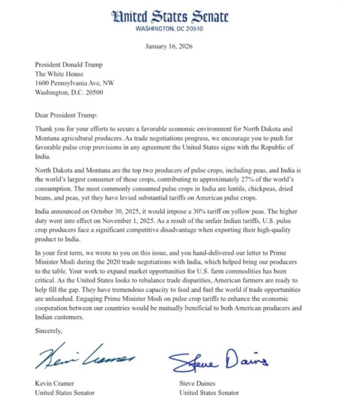 US senators have written to their President to negotiate on behalf of pulse farmers of North Dakota and Montana after India imposed 30% tariffs on USA-produced yellow peas since November 1, 2025. In a letter to Donald Trump dated January 16, senators Kevin Cramer and Steve Daines have urged their president to “push for favourable pulse crop provisions in any agreement that the US government signs with India.