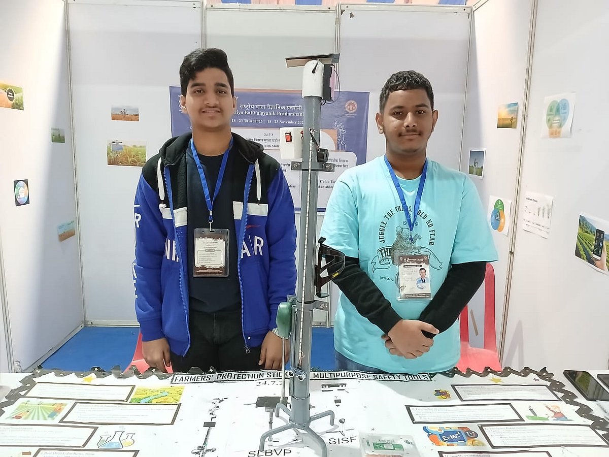 Prepared by Mohammad Abdul Aziz Mohteshim and Syed Naimatullah Sufiyan Khundmiry from All Saints High School, Hyderabad, the exhibit demonstrates a farmers’ smart stick, a multifunctional tool designed for agricultural purposes. It features a soil testing meter to measure moisture, pH, and light intensity, a solar-powered torch for low-light conditions, and a vibration alert with buzzer for reptile detection. It also includes medication reminders and tools for safe electrical repairs, making it a compact, smart, and farmer-friendly device.