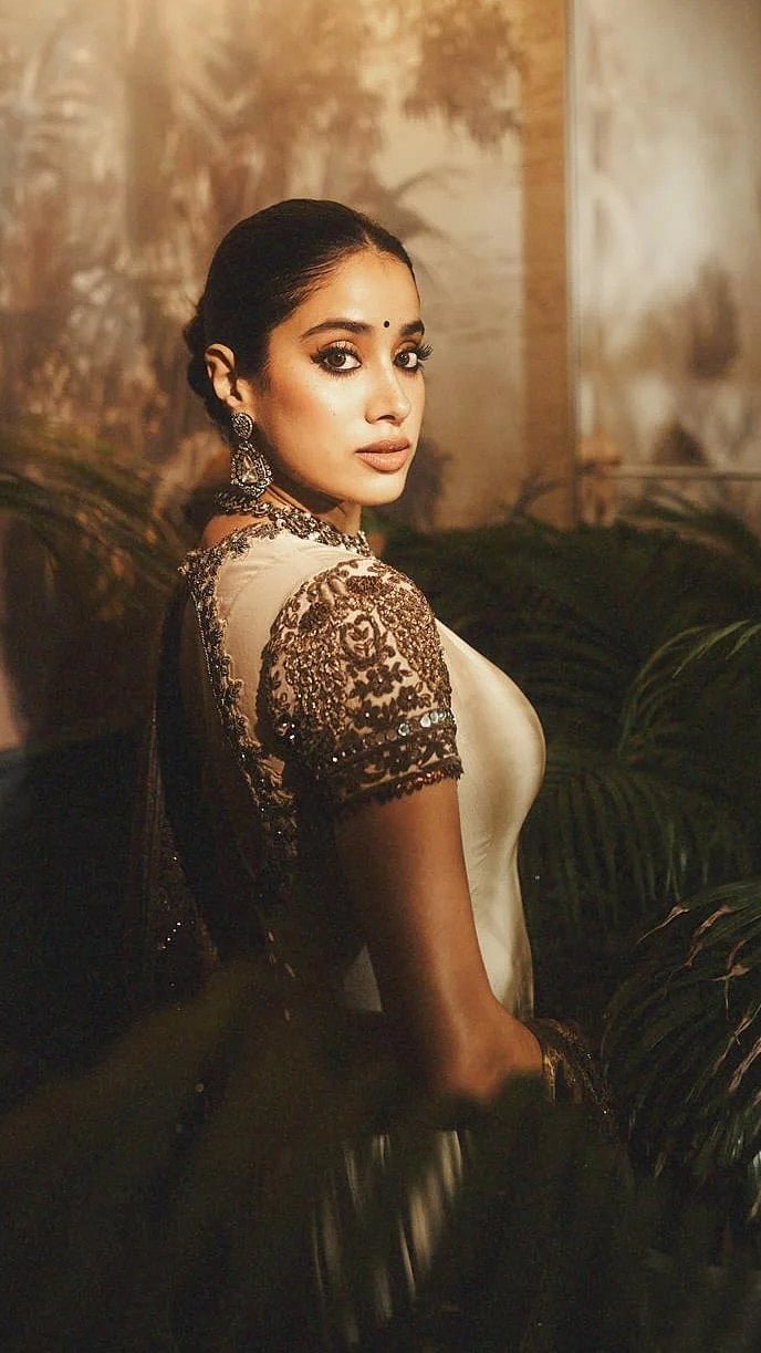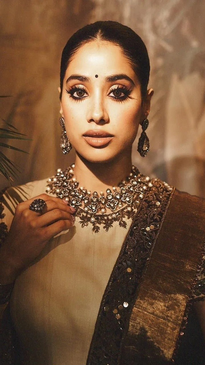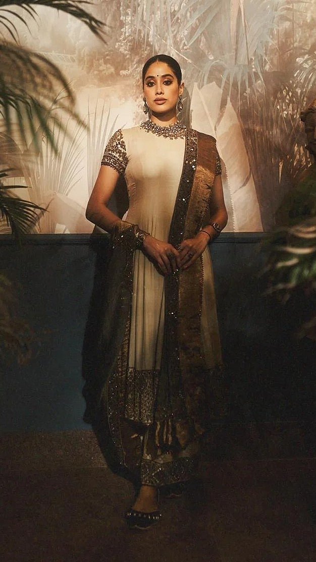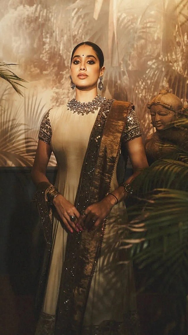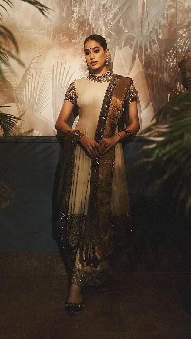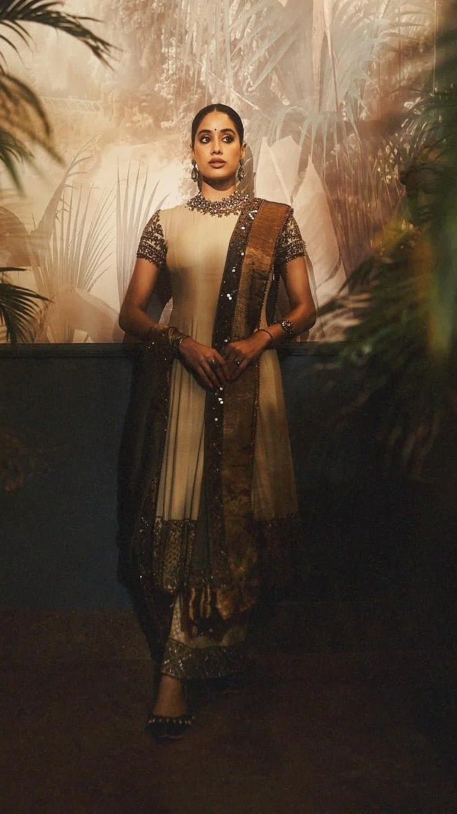 Janhvi Kapoor just delivered another stunning look, this time with a dose of vintage elegance in a heritage-inspired Anarkali piece The Gen-Z star donned a soft beige Anarkali adorned with bronze-metallic embroidery and heavy sequins along the bordersJanhvi paired the Anarkali with a matching embellished palazzos and a sheer dupatta, featuring antique gold border and subtle metal-thread accentsThe actress complemented with a oxidised-metal choker, matching earrings, a statement kada, and a bold ringTo balance the old-world palette, she carried a chic silver metallic mini-bag and wore a beadwork-embroidered juttis