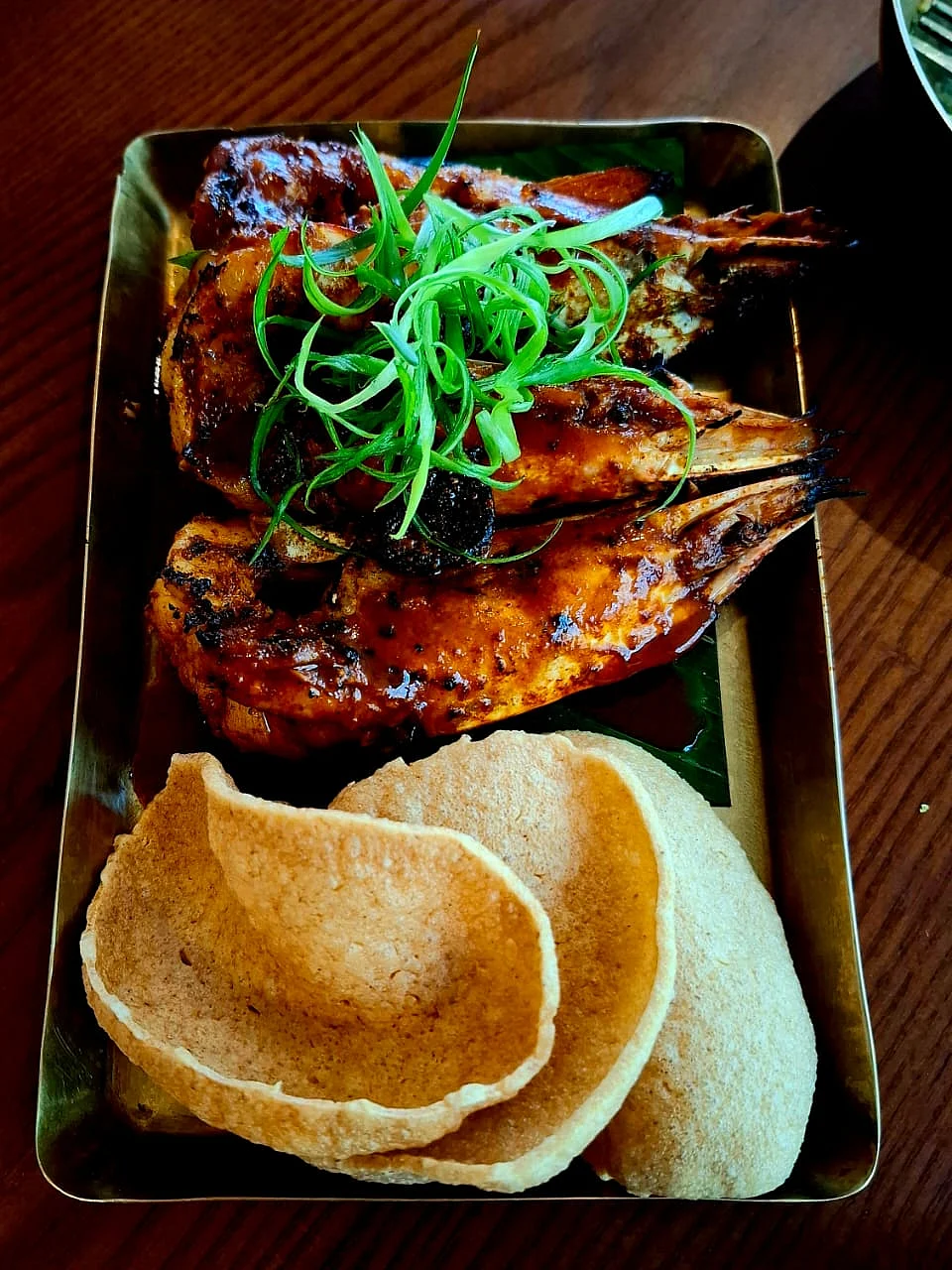 Their signature cocktails too carry the coastal theme forward with offerings like Sea Spice – it’s like a solkadhi (kokum, coriander leaves, and green chilli infused coconut milk) blended with distilled rum that’s high on feta cheese and prawns. They have succeeded in keeping the fishy smell away while maintaining the subtle prawn flavour in the drink that finishes smooth with cheese on palate. Pair it with Grilled Kokum Prawns from the Small Plates. Tiger prawns marinated in red chilli powder, coriander powder, turmeric and kokum, grilled well enough to retain the juice are served with prawn crackers and some marinade. Goes well with smooth taste of Sea Spice. Kerala Fried Chicken is crisp, tasty, with spicy little bite served with a habanero sauce and curry leaf garnish.