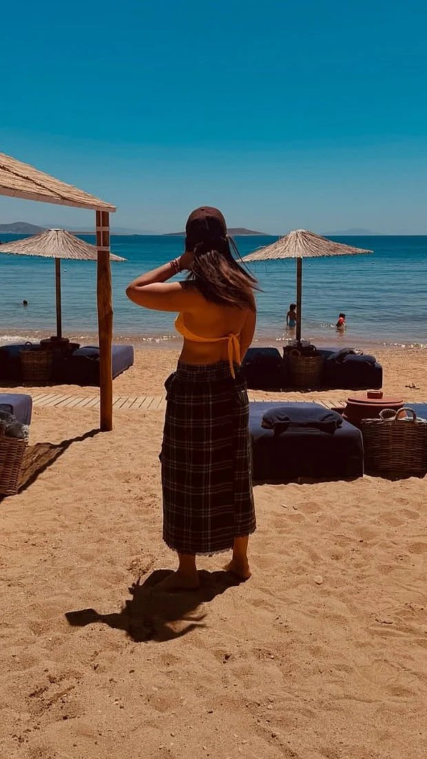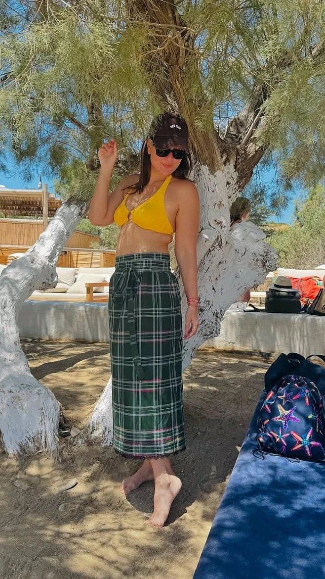 Bollywood actress Kareena Kapoor Khan is currently having the best time of her life in GreeceSharing a series of stunning pictures from the beach outing on Instagram, Bebo wrote, “Did a lungi dance in Greece… had fun, must try .” And for her vacay look, Kareena styled a yellow halter-neck bikini top with a lungi-style checkered skirt The unique lungi skirt, from the indie brand Gulsohrab Studio, featured checkered patterns in black and dark green hues with a tie-up pattern around the waist For the accessories, the actress opted for a few bracelets, classic sunglasses and a black cap As always, Bebo kept her glam natural and sun-kissed with pink-toned cheeks and nude lips, while her hair was left naturally open