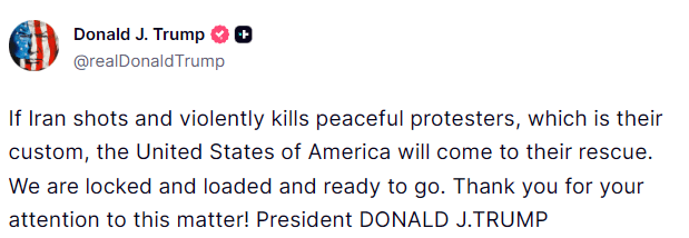 “If Iran shoots and violently kills peaceful protesters, which is their custom, the United States of America will come to their rescue. We are locked and loaded and ready to go,” the president wrote on Truth Social on 2nd January and concluded the statement with his signature, “Thank you for your attention to this matter,” alongside his name.
