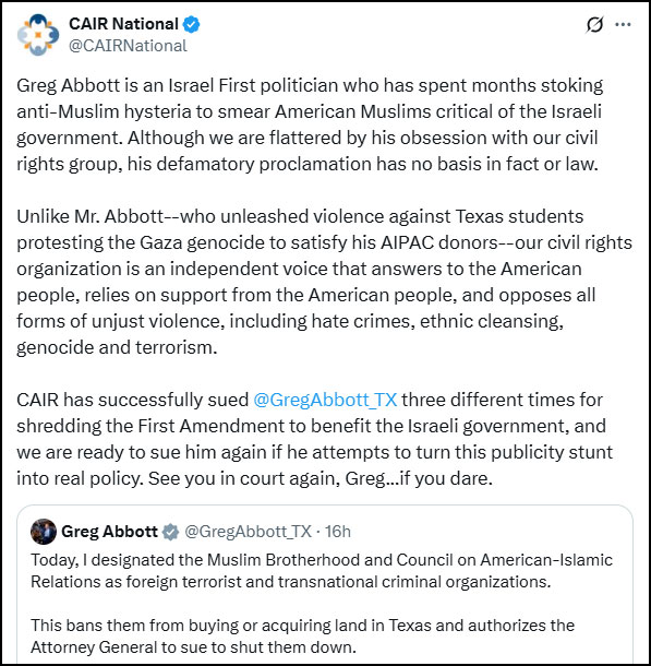 In response, CAIR threatened to sue Greg Abbott and called him an “Israel First politician” who has spent “months stoking anti-Muslim hysteria to smear American Muslims” who are critical of the Israeli government.
