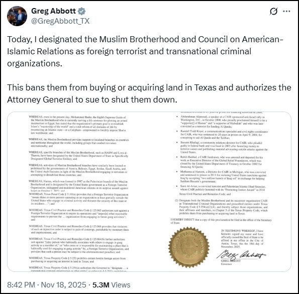 On 18th November (local time), Texas Governor Greg Abbott officially designated the Council on American-Islamic Relations (CAIR) as a Foreign Terrorist Organisation and a Transnational Criminal Organisation under state law. The proclamation lists CAIR alongside the Muslim Brotherhood, which Abbott identified as its “successor organisation”. Following the designation, both groups have now been restricted from acquiring land in Texas. It has opened the door to enhanced civil and criminal penalties for anyone aiding their activities.