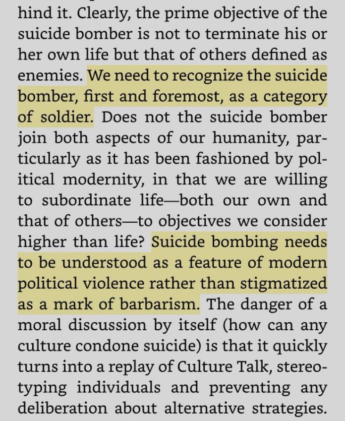 Building his argument on this, Mamdani said that, unlike the Western media’s view of the suicide bombers as a throwback to pre-modernity, either as adult irrationality or as a response of adolescents coerced by patriarchal authority. The suicide bomber comes out of the history of the Intifada.”