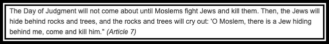 The Palestinian jihadist outfit draws inspiration from the Islamic holy texts to justify its hatred for and fight against the Jews. The Hamas Covenant’s Article 7 says,“The Day of Judgment will not come about until Moslems fight Jews and kill them. Then, the Jews will hide behind rocks and trees, and the rocks and trees will cry out: ‘O Moslem, there is a Jew hiding behind me, come and kill him,”