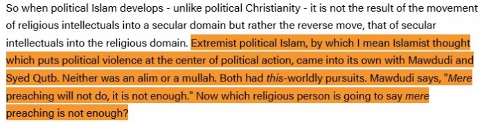 “Extremist political Islam, by which I mean Islamist thought which puts political violence at the center of political action, came into its own with Mawdudi and Syed Qutb. Neither was an alim or a mullah. Both had this-worldly pursuits. Mawdudi says, “Mere preaching will not do, it is not enough.” Now, which religious person is going to say mere preaching is not enough?” he told Asia Society.