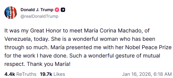President Donald J. Trump meets with María Corina Machado of Venezuela in the Oval Office, during which she presented the President with her Nobel Peace Prize in recognition and honor.