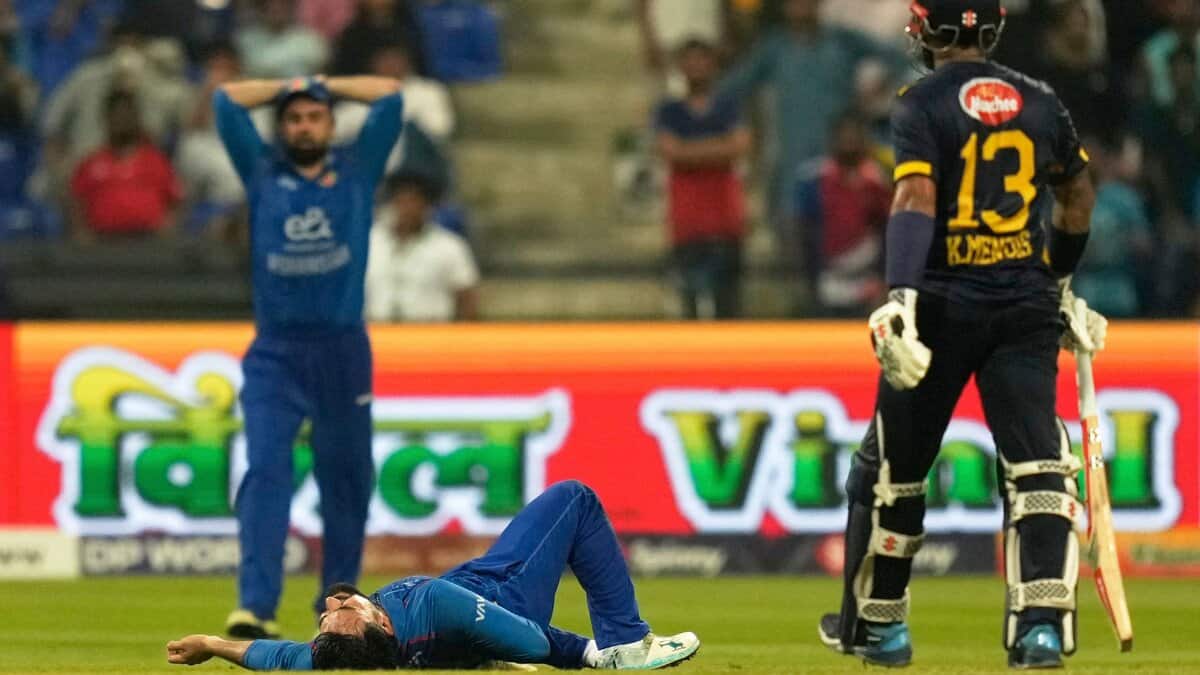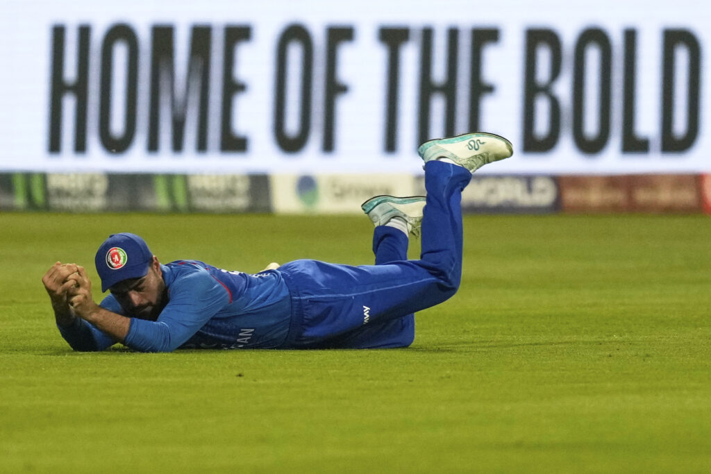 Afghanistan’s Rashid Khan lies on the ground after injuring himself while fielding during the Asia Cup cricket match between Afghanistan and Sri Lanka at Zayed Cricket Stadium in Abu Dhabi, United Arab Emirates, Thursday, Sept. 18, 2025. AP/PTI(AP09_18_2025_000418B)