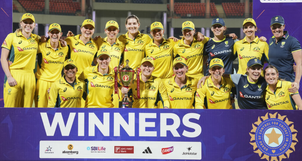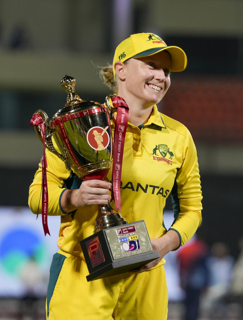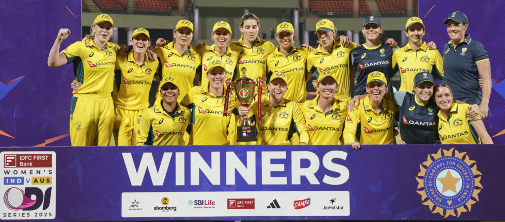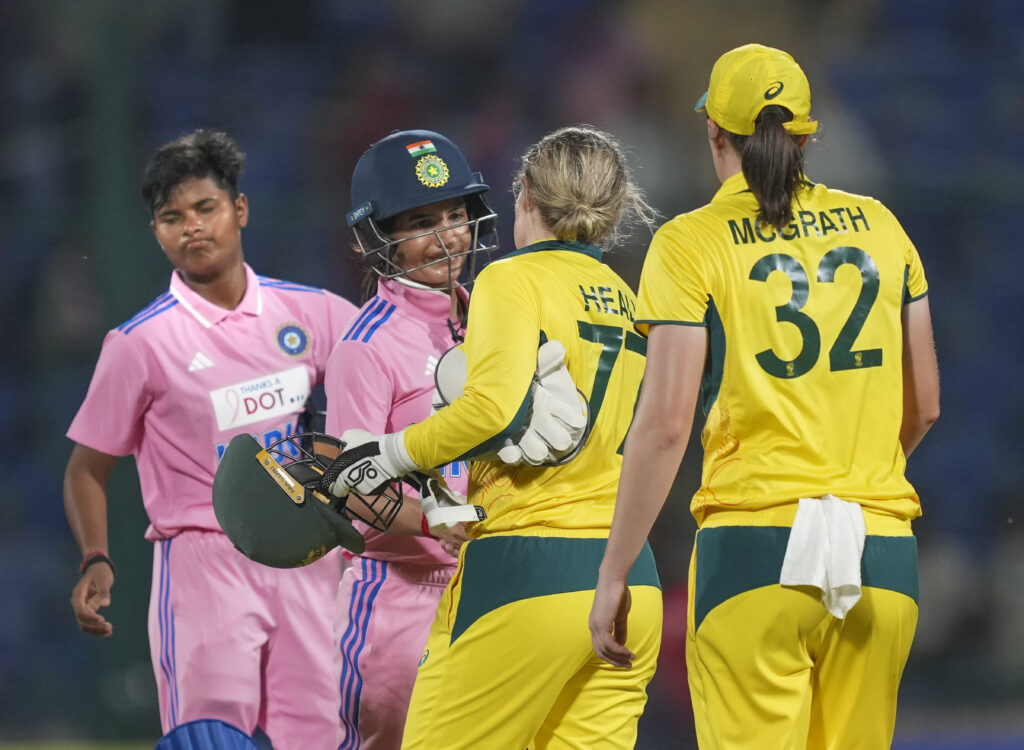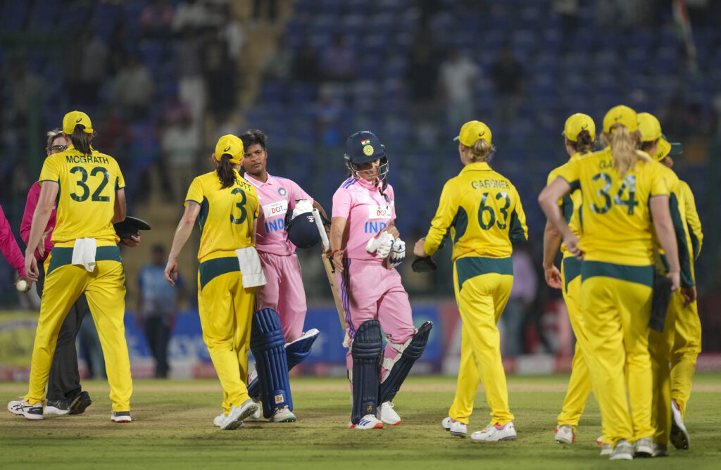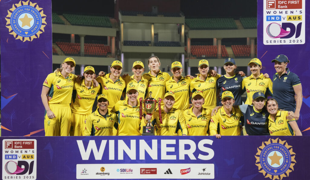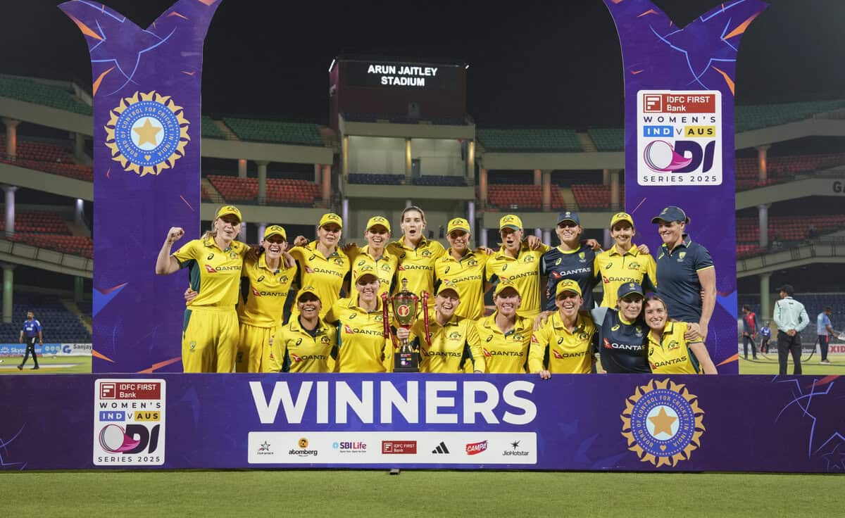 New Delhi: Australian team members celebrate with the trophy during the presentation ceremony after they won the third ODI cricket match of a series between India Women and Australia Women, at the Arun Jaitley Stadium, in New Delhi, Saturday, Sept. 20, 2025. (PTI Photo/Atul Yadav) (PTI09_20_2025_000584A)New Delhi: Australian team members celebrate with the trophy during the presentation ceremony after they won the third ODI cricket match of a series between India Women and Australia Women, at the Arun Jaitley Stadium, in New Delhi, Saturday, Sept. 20, 2025. (PTI Photo/Atul Yadav) (PTI09_20_2025_000579B)New Delhi: Australian team members celebrate with the trophy during the presentation ceremony after they won the third ODI cricket match of a series between India Women and Australia Women, at the Arun Jaitley Stadium, in New Delhi, Saturday, Sept. 20, 2025. (PTI Photo/Atul Yadav) (PTI09_20_2025_000580B)New Delhi: Australia’s captain Alyssa Healy lifts the trophy during the presentation ceremony after winning the third ODI cricket match of a series between India Women and Australia Women, at the Arun Jaitley Stadium, in New Delhi, Saturday, Sept. 20, 2025. (PTI Photo/Atul Yadav) (PTI09_20_2025_000590A)New Delhi: Australian team members celebrate with the trophy during the presentation ceremony after they won the third ODI cricket match of a series between India Women and Australia Women, at the Arun Jaitley Stadium, in New Delhi, Saturday, Sept. 20, 2025. (PTI Photo/Atul Yadav) (PTI09_20_2025_000581A)New Delhi: India’s Kranti Goud and Renuka Singh congratulate Australias captain Alyssa Healy and Tahlia McGrath after the Australians won the third ODI cricket match of a series between India Women and Australia Women, at the Arun Jaitley Stadium, in New Delhi, Saturday, Sept. 20, 2025. (PTI Photo/Atul Yadav) (PTI09_20_2025_000550A)New Delhi: India’s Kranti Goud and Renuka Singh congratulate Australias players after the latter won the third ODI cricket match of a series between India Women and Australia Women, at the Arun Jaitley Stadium, in New Delhi, Saturday, Sept. 20, 2025. (PTI Photo/Atul Yadav) (PTI09_20_2025_000547B)