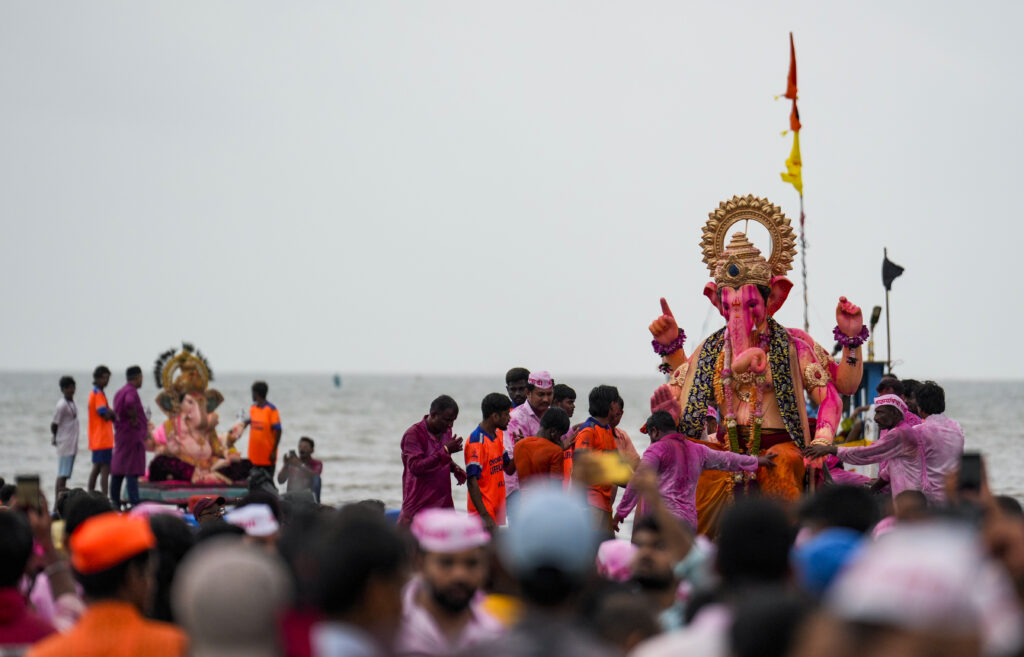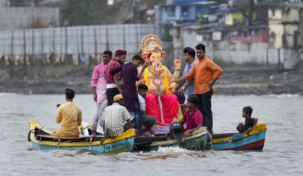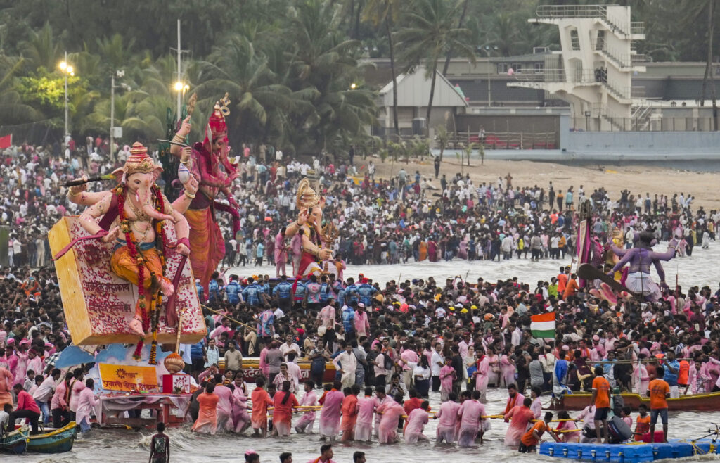 Mumbai: People take part in ‘visarjan’, immersion, of idols of Lord Ganesha during the ‘Ganesh Chaturthi’ festival, at Girgaon Chowpatty, in Mumbai, Maharashtra, Saturday, Sept. 6, 2025. (PTI Photo/Kunal Patil) (PTI09_06_2025_000310A)