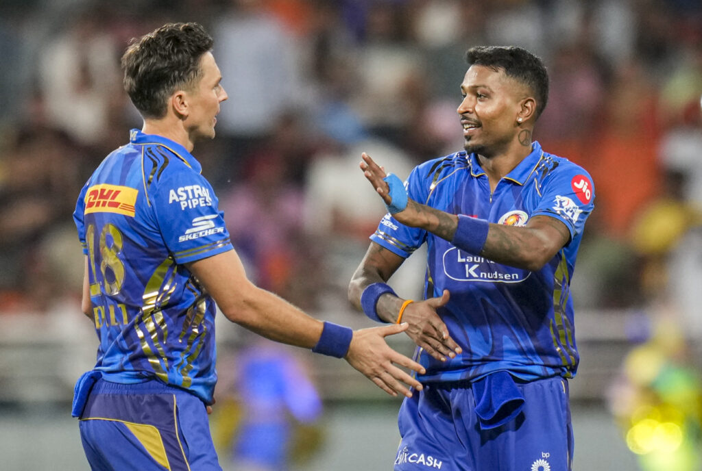 New Chandigarh: Mumbai Indians’ Hardik Pandya and Trent Boult celebrate the wicket of Gujarat Titans’ Sherfane Rutherford during the Indian Premier League (IPL) 2025 Eliminator cricket match between Mumbai Indians and Gujarat Titans, in New Chandigarh, Friday, May 30, 2025. (PTI Photo/Ravi Choudhary)(PTI05_30_2025_000632B)