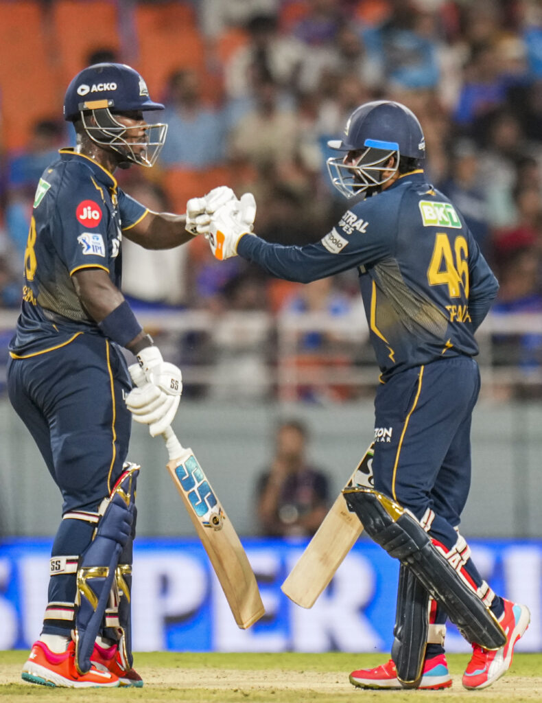 New Chandigarh: Gujarat Titans’ Rahul Tewatia and Sherfane Rutherford during the Indian Premier League (IPL) 2025 Eliminator cricket match between Mumbai Indians and Gujarat Titans, in New Chandigarh, Friday, May 30, 2025. (PTI Photo/Ravi Choudhary)(PTI05_30_2025_000637B)